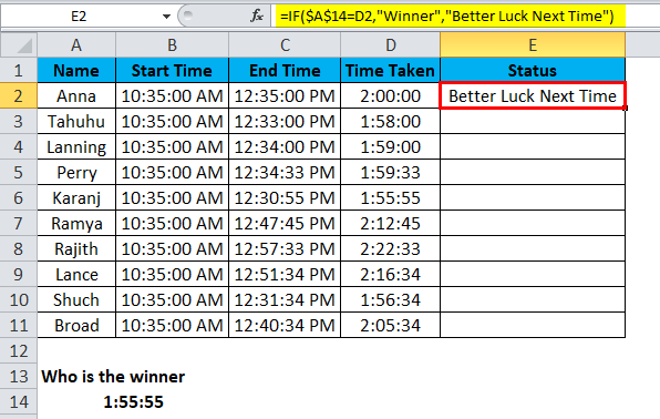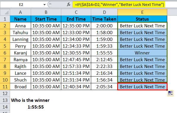 If the value arrived by a SMALL function is equal to the actual time taken value, we call it as Winner or Better Luck Next Time.
