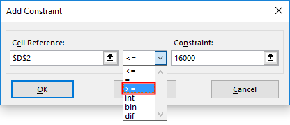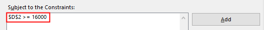 Now, the first parameter of Constraints is added by inputting the cell reference & constraint value, i.e., Cost price or stockiest Price per unit, which is either more than or equal to 16,000 (>=16000)