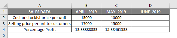 In the table above, the monthly sales data of price per unit, containing Cost or stockiest Price per unit & Selling Price per unit to customers. Now, I have April & May month with a percentage profit for each unit, i.e., 13.33% & 15.38%, respectively.
