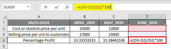 Here, B4 & C4 is the percentage profit for April & May 2019, calculated with the help of the formula below.