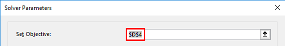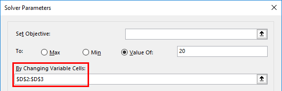 Once the solver is selected, a Solver parameter window appears, where you need to mention the “Target Cell” as a “D4” cell reference in the set objective text box and select a radio button as “Value of”, In the text box of it set the targeted profit as 20 %