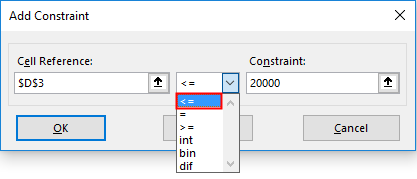 Now it reflects under Subject to the Constraints box, and again we need to click on add to add one more constraint, i.e., Selling Price per unit to customers. It is added by inputting the cell reference & constraint value, which is either less than or equal to 20,000 (<=20000)