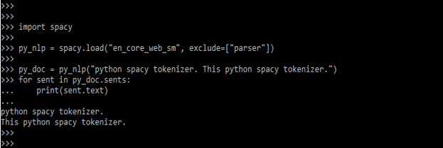 - The data is statistical. The parser that just provides sentence boundaries is replaced by Sentence Recognizer. The below example shows spaCy tokenizer by using a statistical sentence segmenter.