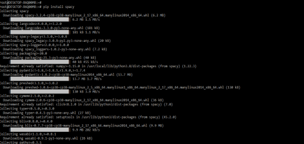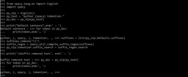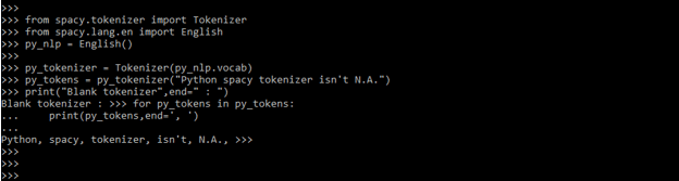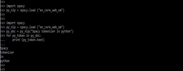 - After login into the python shell, we are checking scrapy tokenizer is properly installed on our system. We can check the same by importing the spaCy module into our code. We can import the spaCy tokenizer module by using the import keyword. The below example shows how to import the spaCy module into our program as follows.