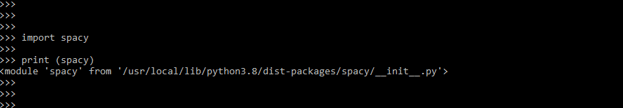 - After installing the spaCy we need to check it is properly installed on our system, we need to login into the python shell first to import the spaCy module. The below example shows login into the python shell are as follows.