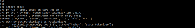 retokenizer.merge (py_doc[3:5], attrs={"Python": "spacy tokenizer"})