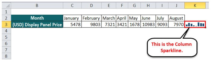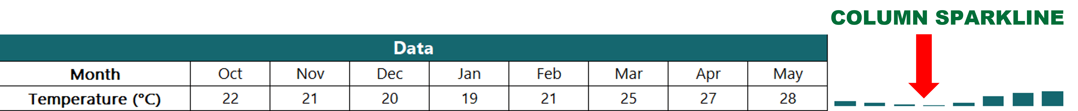 - Column: This type of sparkline shows the data trend using vertical columns. Column sparklines help compare data values and identify low and high points.