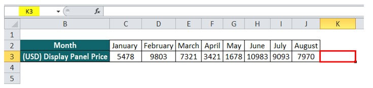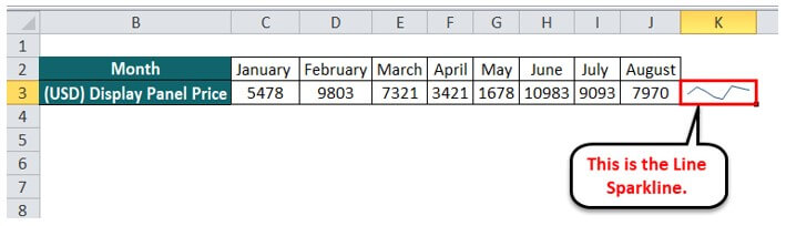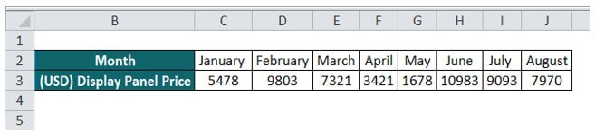 The following example shows the fluctuating prices of Display Panel across various months. We want to represent the same using the Sparkline feature of Excel.