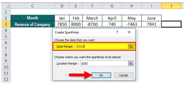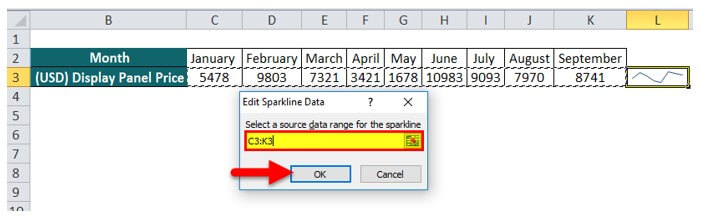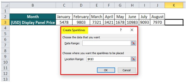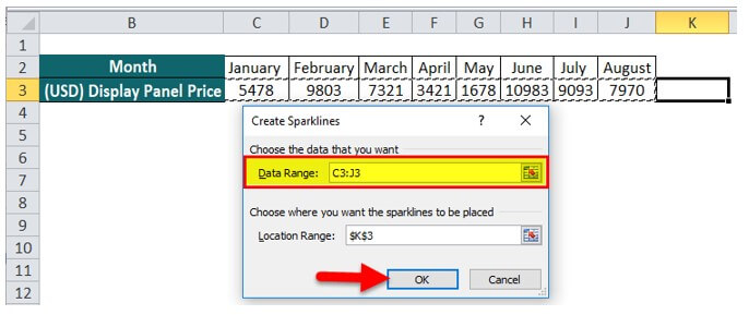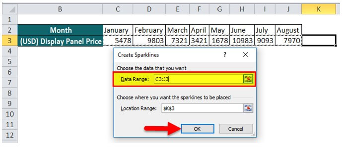 Step 3: In the Create Sparklines window, specify the data range (C3:J3), and the Location Range is automatically filled with the desired cell (K3), as you have already selected it.