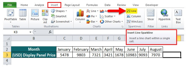 Step 1: Select an empty cell (Cell K3) where you want to insert the sparkline.