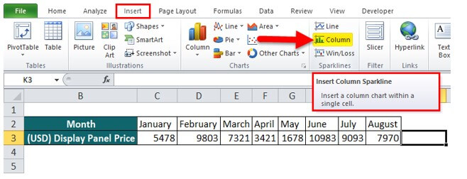Step 2: Go to Insert and choose Column from the Sparklines menu.