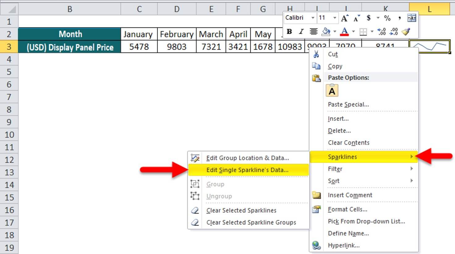 Step 2: In the context menu, go to Sparklines, and click Edit Single Sparkline’s Data.