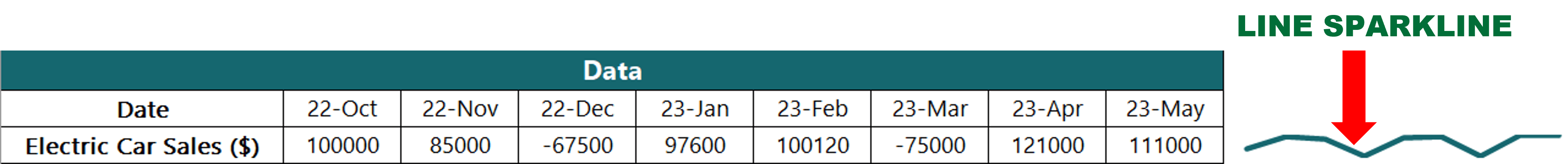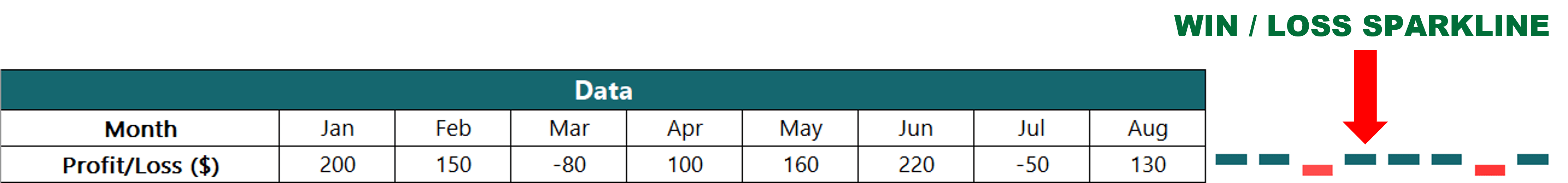 - Win/Loss: It displays the data trend as positive or negative symbols. Win/ Loss sparklines help display changes in data values that represent gains or losses.
