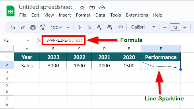 Answer: To show sparklines in Google Sheets, insert the formula =SPARKLINE(range) and press Enter. The formula will insert a line sparkline by default, as illustrated in the image below.