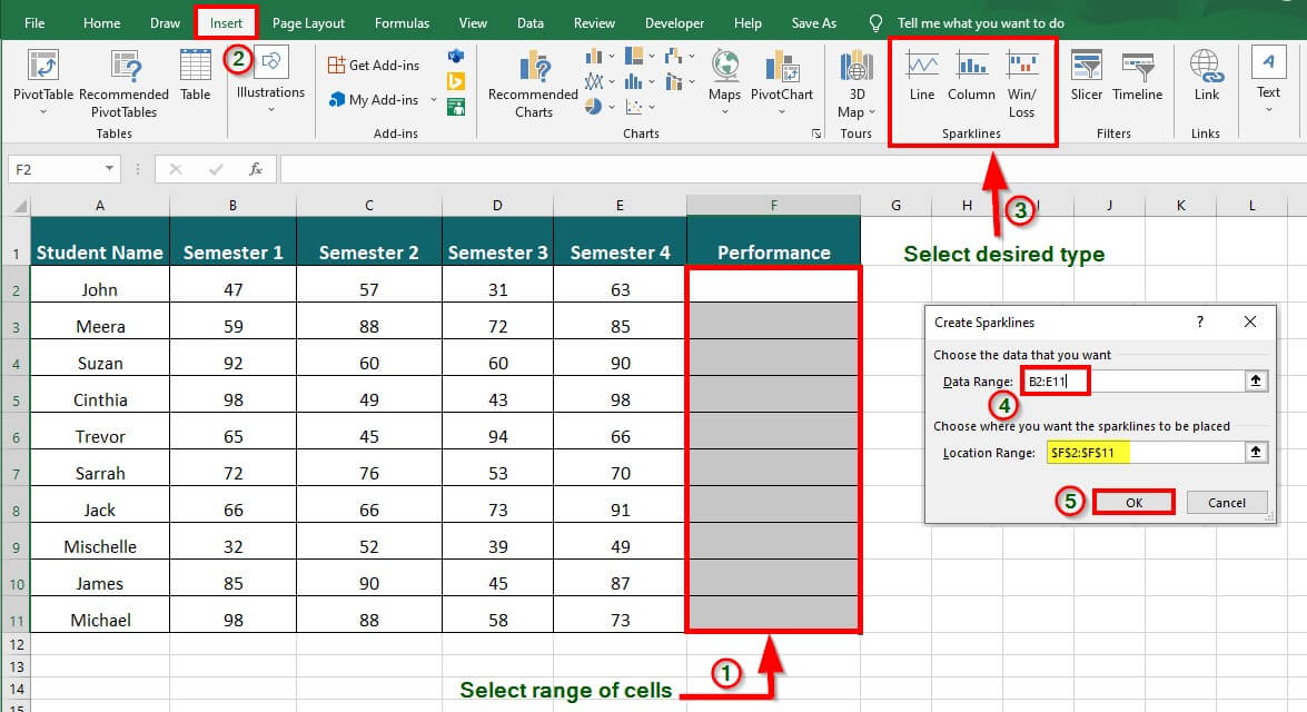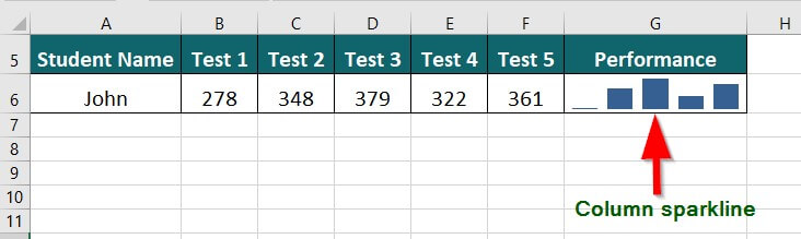 For instance, you can use a Column sparkline to visualize a student’s performance in various tests, as shown in the image below.