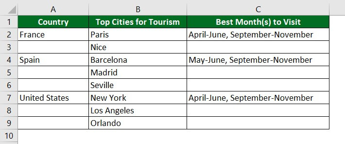 Consider the below data of tourist places of a particular country and their best month to visit. We want to split the already merged cells (columns A and C).