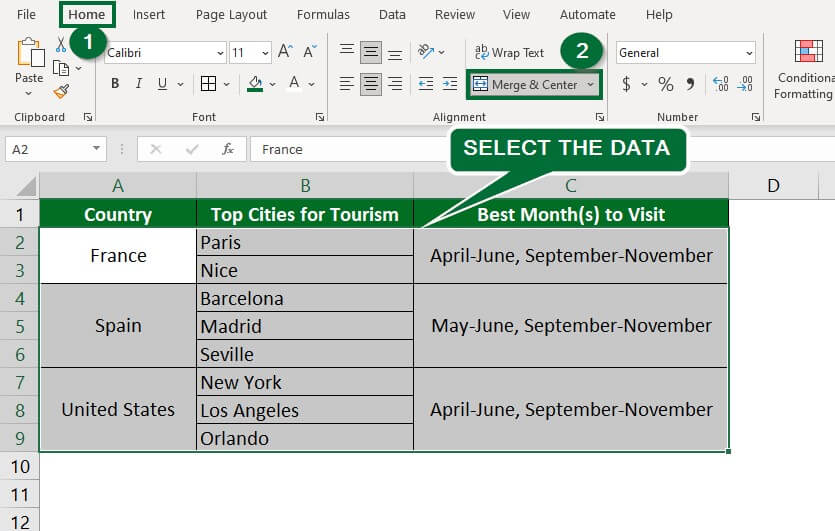 Step 2: Go to the “Home” tab > Alignment group, and click “Merge & Center“, as shown below.