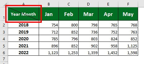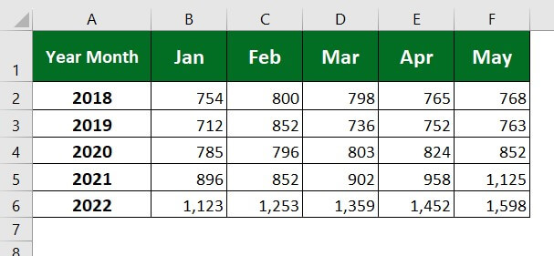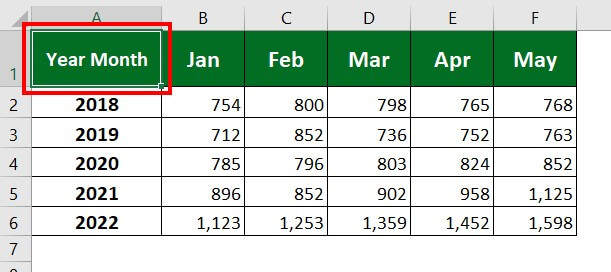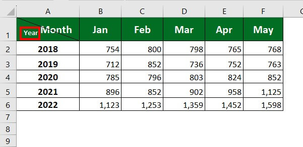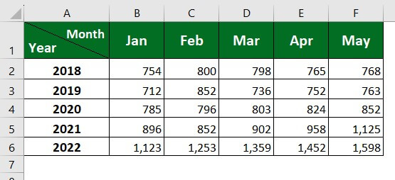 Let’s consider the below sales data of a company. Here, we want to add headings for rows and columns. For better understanding, we will use “Year” for rows and “Month” for columns.