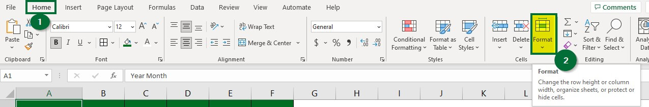 Step 2: Go to the “Home” tab and click on “Format” under the “Cells” group, as shown below.