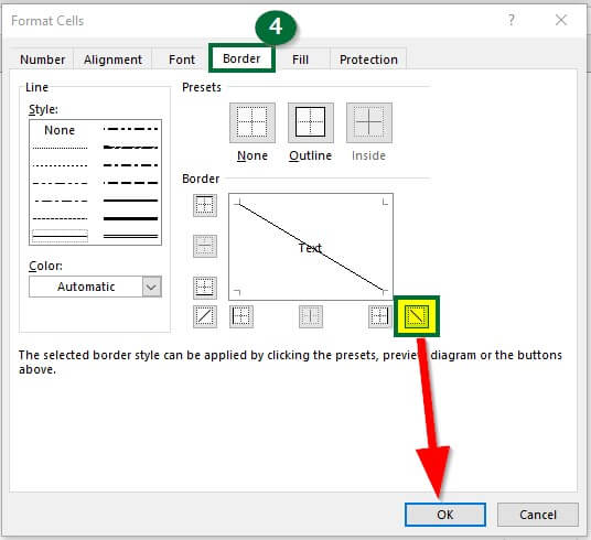 Step 4: Go to the “Border” tab. Click the right side box spitted diagonally as shown below and press “Ok“.