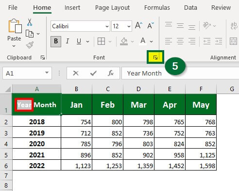 Step 5: Select “Year” and click on the downward arrow at the bottom-right corner of the “Font” group of the “Home” tab.