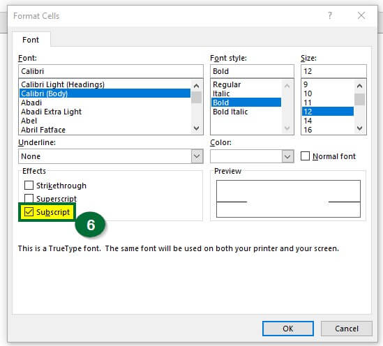 Step 6: Select “Subscript” under the “Effects” section and click on “OK”.