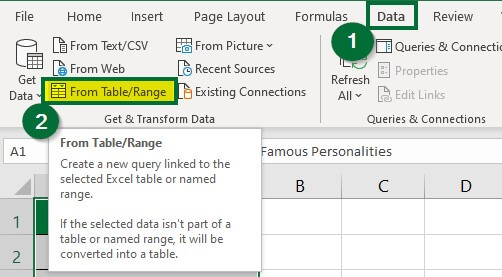 Step 2: Go to the “Data” tab, and click the “From Table/Range” button under the “Get & Transform Data” group.