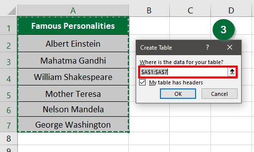 Step 3: Select the table range and press OK, as shown below.
