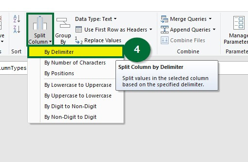 Step 4: Select the entire column and go to the “Home” tab >under “Transform group”> “Split Column”> select “By Delimiter”