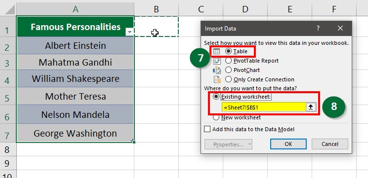Step 7: Select the “Table” option under “Select how you want to view this data in your workbook” and enter the desired cell where we want the data to display in the “Existing workbook”. Click on “OK”.