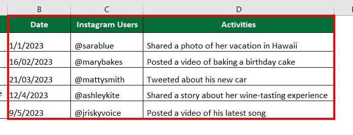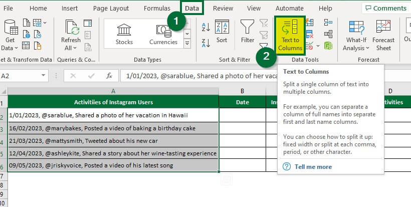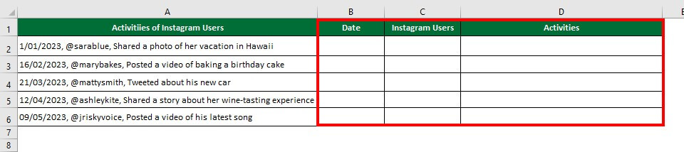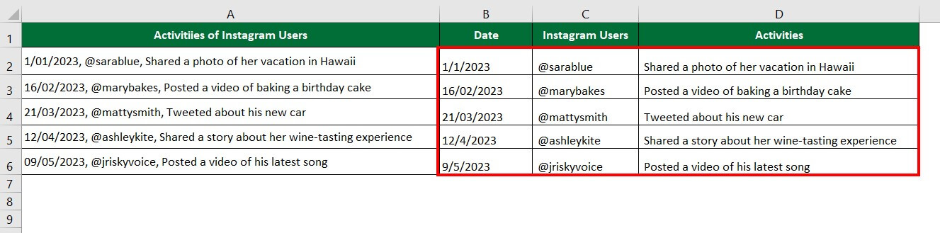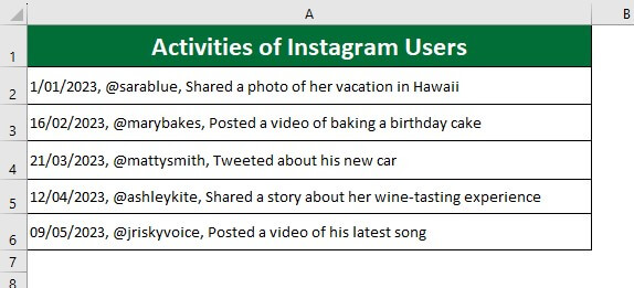 Consider the below data on the activities of Instagram users. Here, all the data is in the same column. We want to separate the data into different columns like Date, Instagram Users, and Activities using the text-to-column delimited method, which involves using a specific character (in this case, a comma) to separate the data into its respective columns.