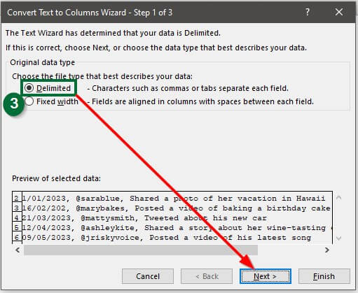 A “Convert Text to Columns Wizard” will open.