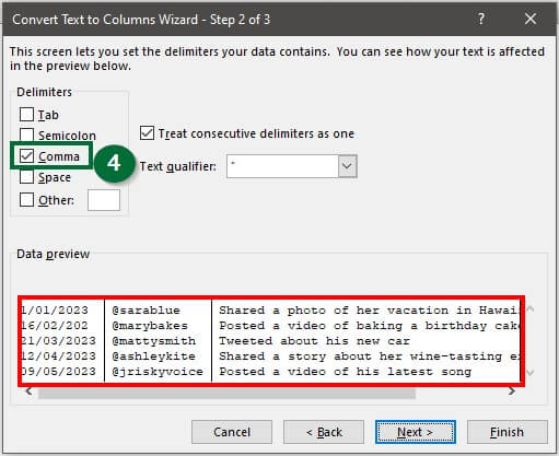 Step 4: Select “Comma” under the “Delimiters” section and click on “Next“.