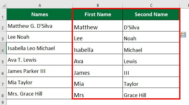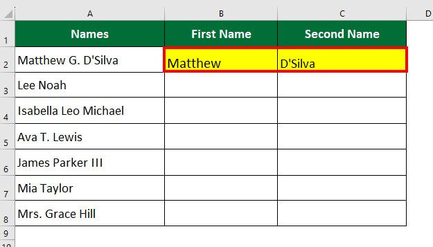Although Flash Fill is easy to use, the results are not dynamic. It does not automatically update the output if the source data is changed. Thus to Split Cell in Excel, we can use various Text functions or create formulas to fetch results if we want dynamic results.