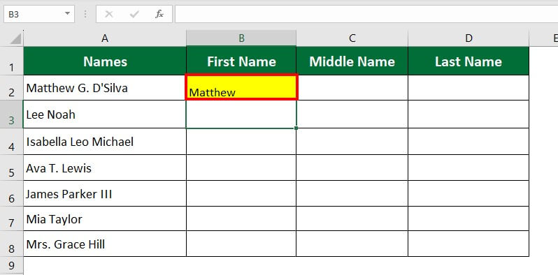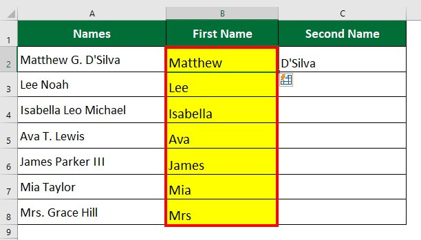 Flash Fill will automatically populate similar data (first name) into other cells. The entire column of B displays the first name of the original names.