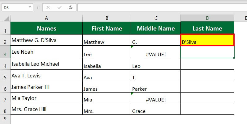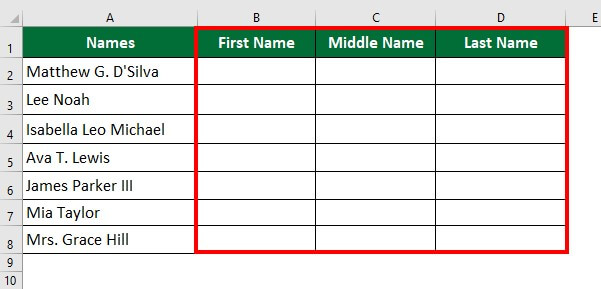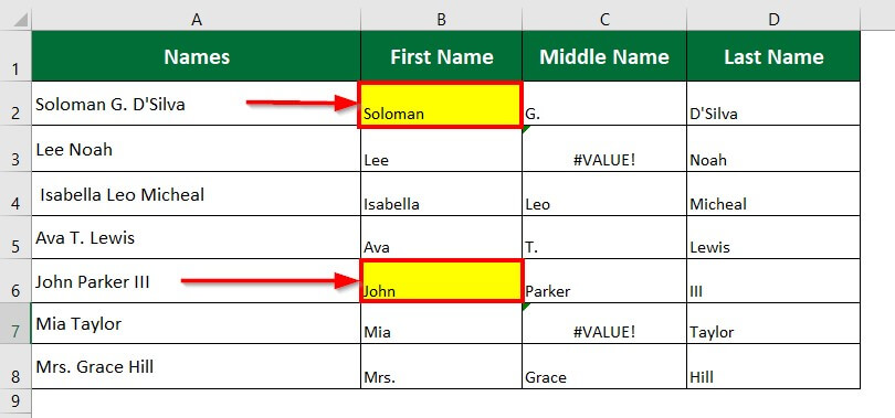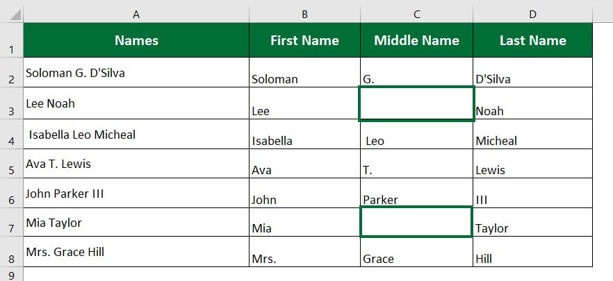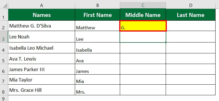 Let’s take the previous example to split full names into first, middle, and last names using LEFT, MID and RIGHT functions.