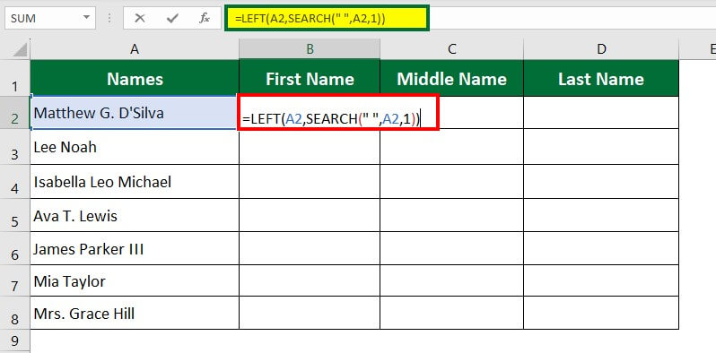 Step 2: Click on Cell B2 and enter the formula “=LEFT(A2,SEARCH(“ “,A2,1))”.