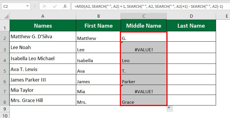The formula returns the middle name, as shown below.
