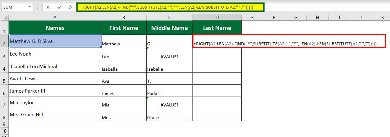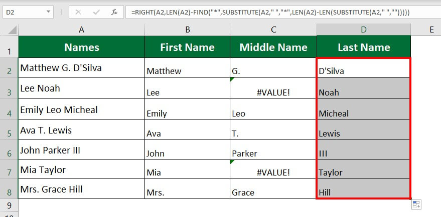 Step 6: Select Cell D2 and enter the formula “=RIGHT(A2,LEN(A2)-FIND(“*”,SUBSTITUTE(A2,” “,”*”,LEN(A2)-LEN(SUBSTITUTE(A2,” “,””)))))
