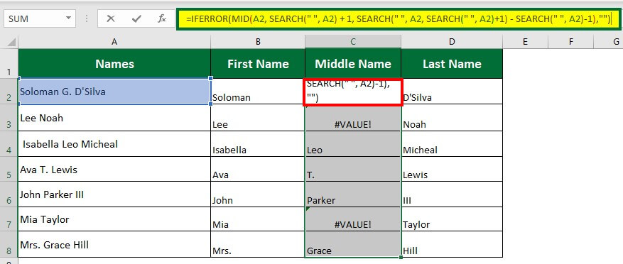 Step 8: Select column 2 (C2:C8) and enter the formula “=IFERROR(MID(A3, SEARCH(” “, A3) + 1, SEARCH(” “, A3, SEARCH(” “, A3)+1) – SEARCH(” “, A3)-1),””)”