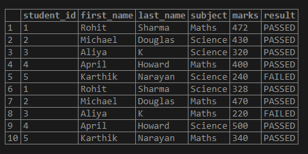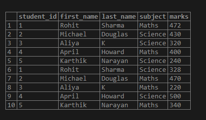 SELECT student_id, first_name, last_name, subject, marks,