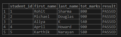 Explanation: In the above example, the CASE statement checks the WHEN part, i.e if marks > 250 are TRUE. If it is TRUE then it returns ‘PASSED’ otherwise moves to the ELSE part of the statement and returns ‘FAILED’.