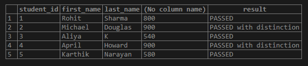 Explanation: In the above example, we have just extended example no. 3. Here, first, we are trying to check if the first WHEN condition i.e. sum(marks) > 500 is true or not. If it is true, we have another WHEN condition, i.e. sum(marks) > 800. If the second condition is TRUE, the student is assigned ‘PASSED with Distinction’, else just ‘PASSED’.