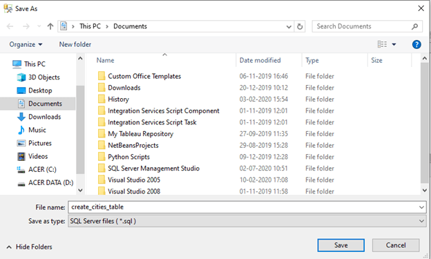 Step 5: Choose a file from the next menu and save the script with the desired name. Here, the file of the extension type by default. If that’s not the case for you, mention .sql as a file extension.