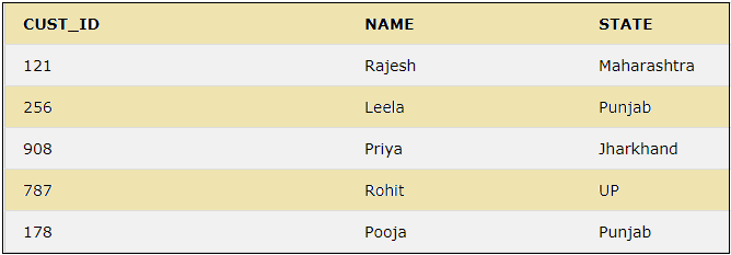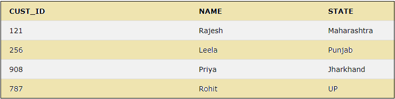 CREATE TABLE CUSTOMER (CUST_ID INT PRIMARY KEY, NAME VARCHAR(50), STATE VARCHAR(20));