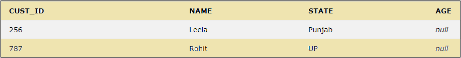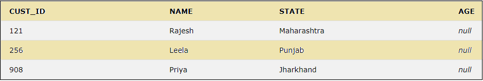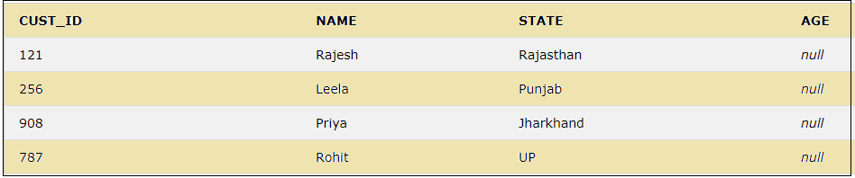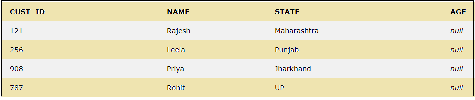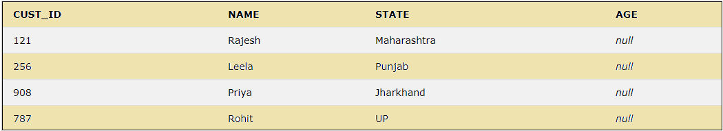This query above will add the new column “AGE” with values for all the rows as null. Also, the above statement uses another SQL keyword ‘ADD’.