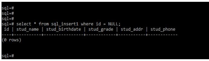 select * from sql_insert1 where id = NULL;