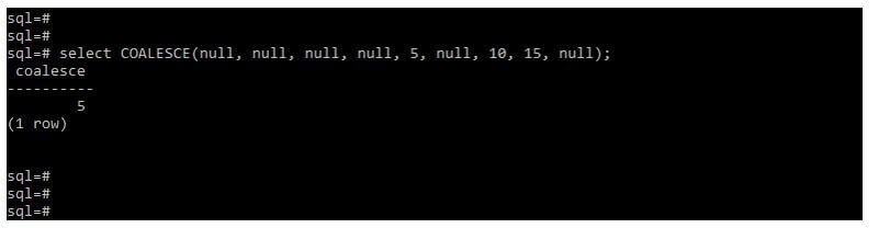 select COALESCE(null, null, null, null, 5, null, 10, 15, null);