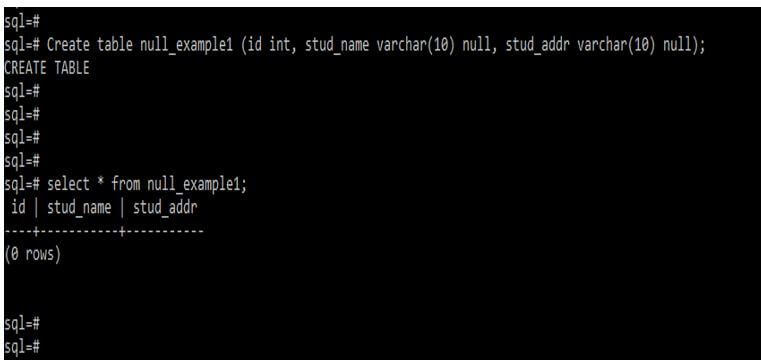 Create table null_example1 (id int, stud_name varchar(10) null, stud_addr varchar(10) null);
