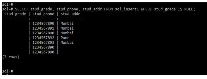 In the below example, we can see that we are retrieving all the values from the stud_phone and stud_addr column from which the value of the stud_grade column is null.